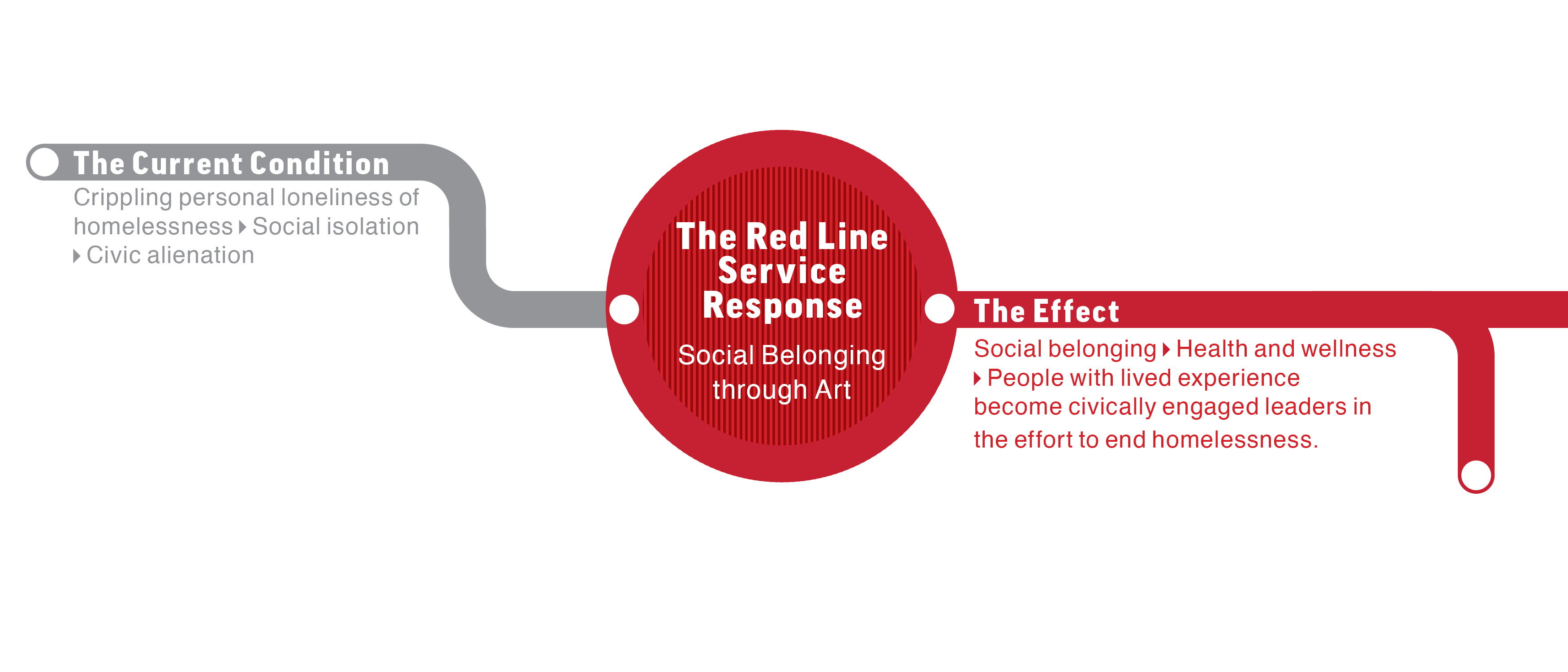 Red Line Service is a community of artists and art lovers with a lived experience of houselessness working together with professionals in the arts to reduce barriers to the arts for all. We insist - as unhoused or housing & food insecure artists and art lovers - that we lead, uplift and sustain the community, with support from professionals in the arts, as co-producers. Some of us want access to arts programming that we can consume and enjoy. Others of us, strive for careers and recognition in the arts. We all acknowledge that the lack of fulfilling cultural experiences, precarious wages, food insecurity and high cost of transportation hinder our success and our ability to live enriching cultural lives. Through art programming, art-making and forging social bonds, we cultivate abundant collective care. Through our depth over breadth programs and events, we: